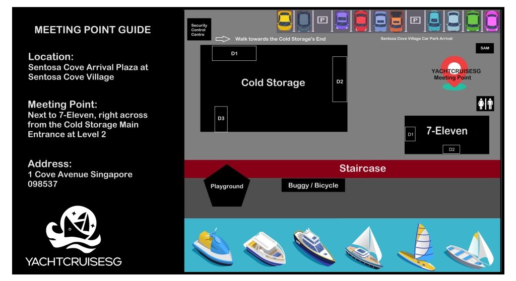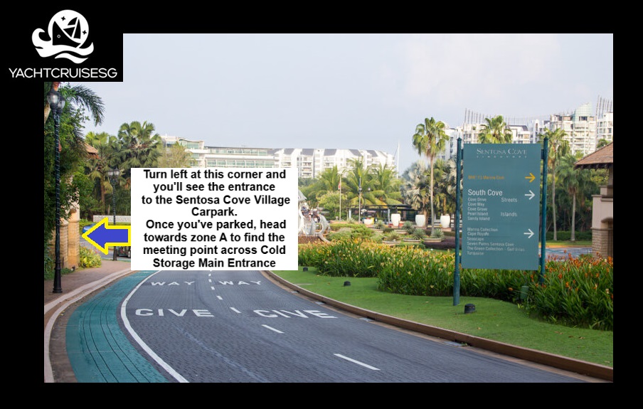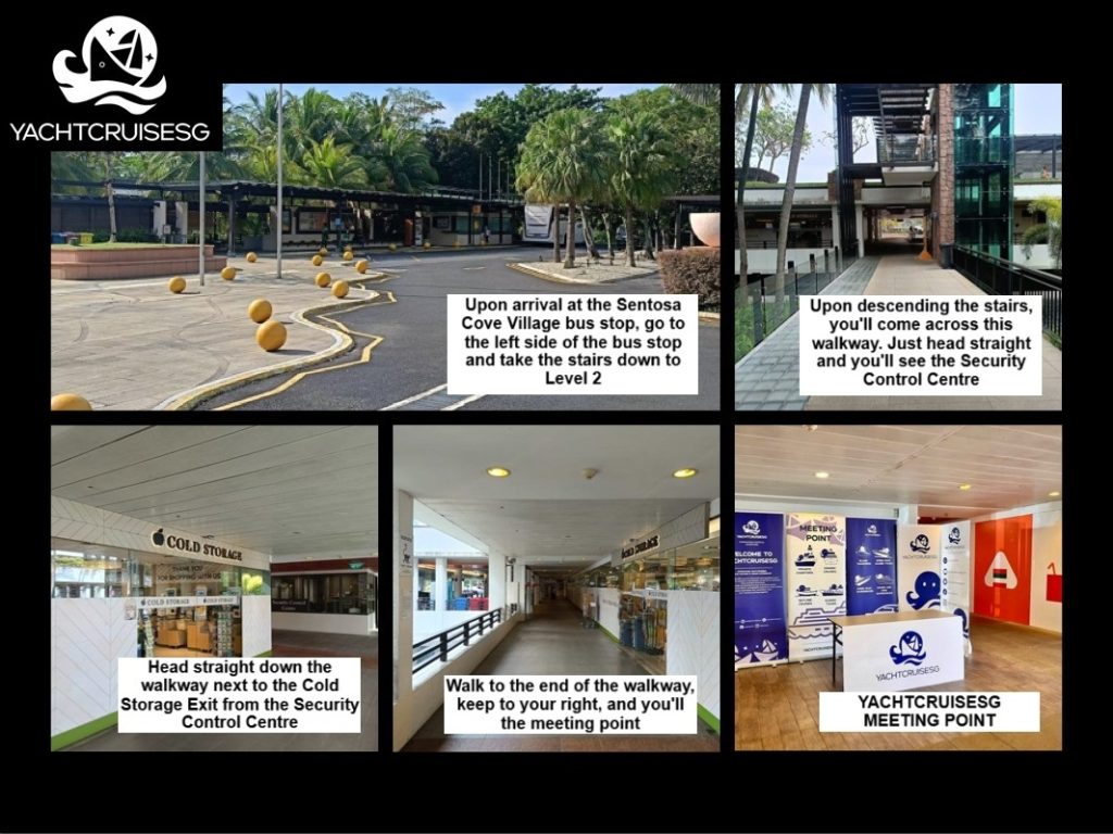 When you arrive at Sentosa Cove Village Bus Stop, go to the left side of the bus stop and take the stairs down to Level 2. Continue walking, and you will come across the security office. Face the security office and continue straight ahead until you reach the end of Cold Storage (carpark on your left), where the meeting point is on the right.